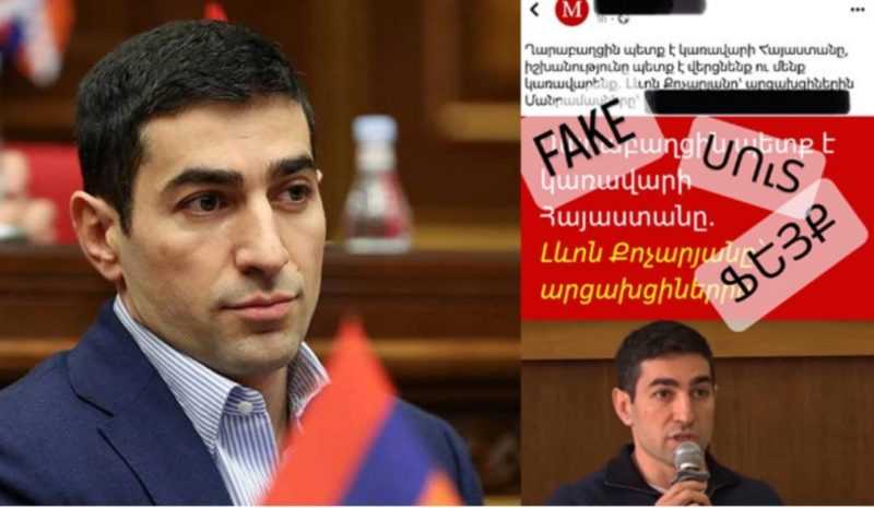 Провластные негодяи вот таким враньем продолжают сеять вражду в нашем обществе. Об этом написал на своей странице в «Facebook» депутат от блока «Армения» Левон Кочарян, касаясь приписываемых ему заявлений.