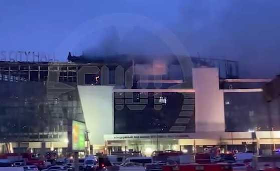 Утренние кадры с места страшного теракта в «Крокусе». Из крыши здания продолжает идти густой дым.
