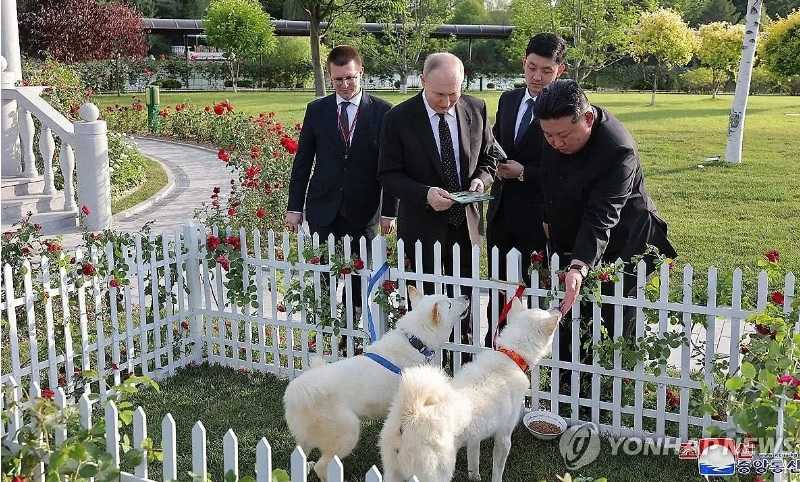 «Товарищ Ким Чен Ын в саду резиденции для почетных гостей Кымсусан подарил президенту Путину пару собак породы пхунсан — национальной породы собак нашей страны», — говорится в сообщении. Пхунсан — крайне редкая и практически неизвестная за пределами КНДР порода собак.